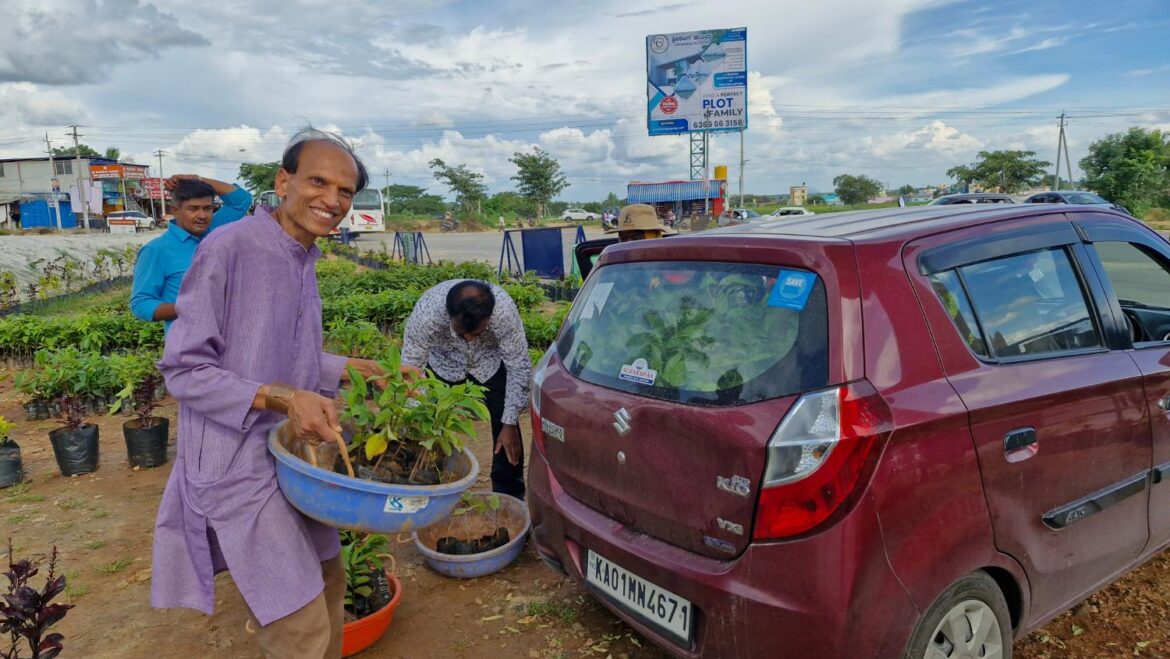 Ajudei -o a carregar as mudas em seu hatchback. Sua fazenda fica a apenas alguns quilômetros do viveiro de Isha, localizado em Chikkaballapur, uma pequena cidade a 65 quilômetros do centro de TI da Índia, Bengaluru. O berçário de Isha oferece mudas de árvore de alta qualidade por um preço escasso de 3 INR por mudas. Além disso, a equipe do berçário fornece a ele uma consulta personalizada gratuita para sua plantação de árvores com base no solo, água e outras condições agrícolas.