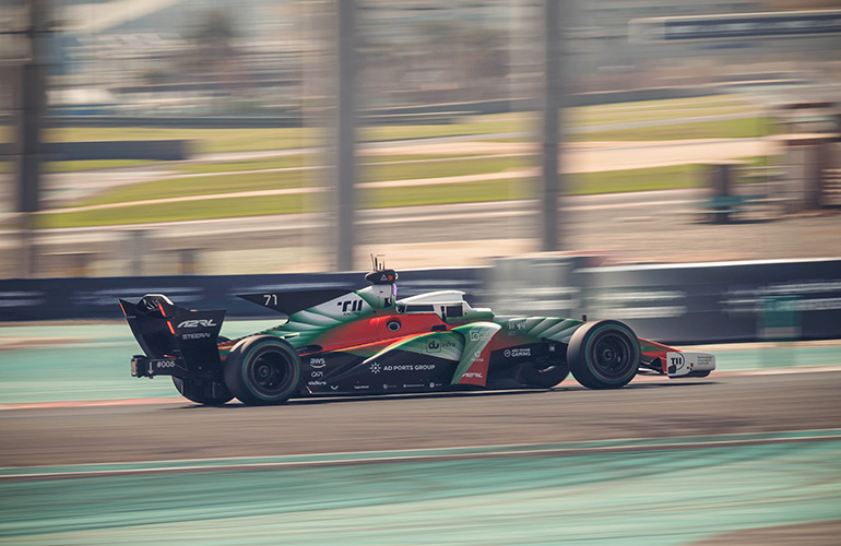 Um carro de corrida EAV-25 na pista do autódromo de Yas Marina. Crédito: SpacesuitMedia
