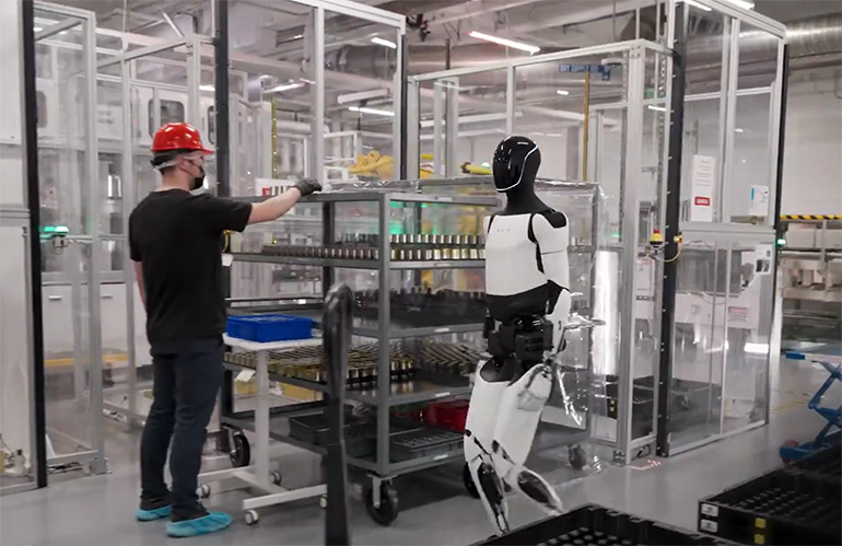 Um robô Humanóide Tesla Optimus atravessa uma fábrica com as pessoas. O comportamento previsível do robô requer controle prioritário e uma estrutura legal. Crédito: Tesla