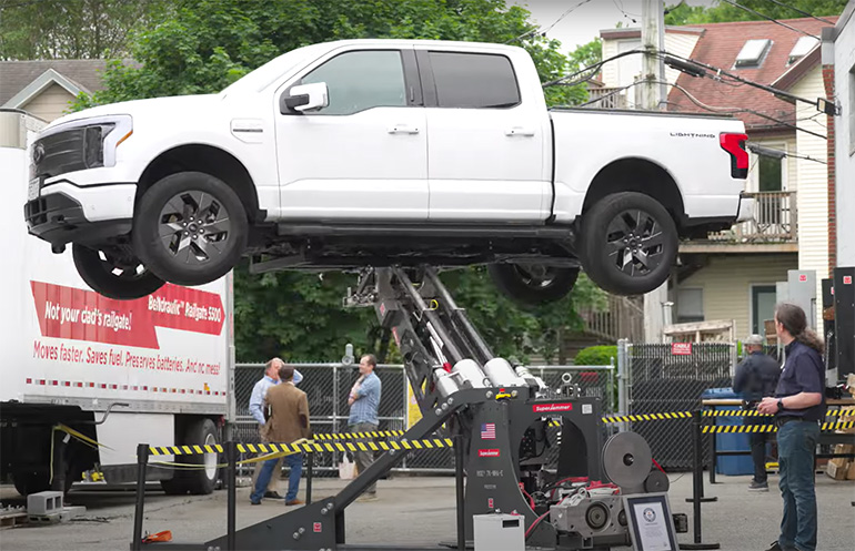 O braço do robô do superjammer de Beltdraulic levantou um raio Ford F 150 durante uma casa aberta. Fonte: Rise Robotics