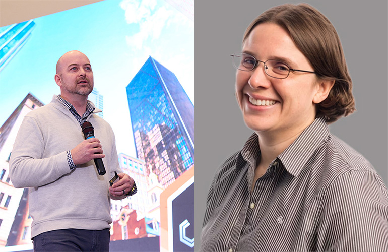 Aaron Saunders (à esquerda) palestra a cúpula de robótica 2025 e a Expo e a Melonee Wise.