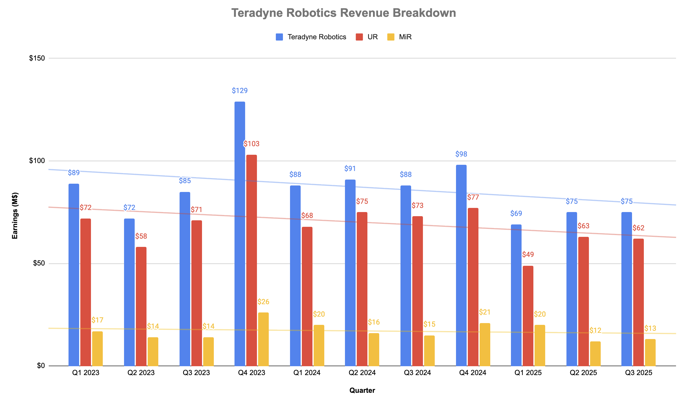 O gráfico acima compartilha os ganhos dos últimos 11 trimestres para MiR, UR e Teradyne Robotics como um todo. Oferece uma visão de como a receita do grupo não atendeu às expectativas. O quarto trimestre de 2023 é um caso atípico no gráfico, já que a receita do grupo atingiu um pico de US$ 129 milhões no trimestre, com a UR desembolsando a maior parte do dinheiro. A receita média dos outros 10 trimestres é a seguinte: