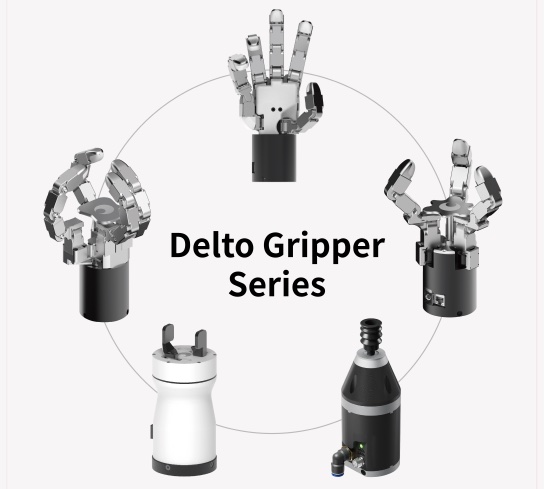 O Delto Gripper DG-5F, no topo, é o mais recente de uma variedade de garra. Fonte: Tesollo